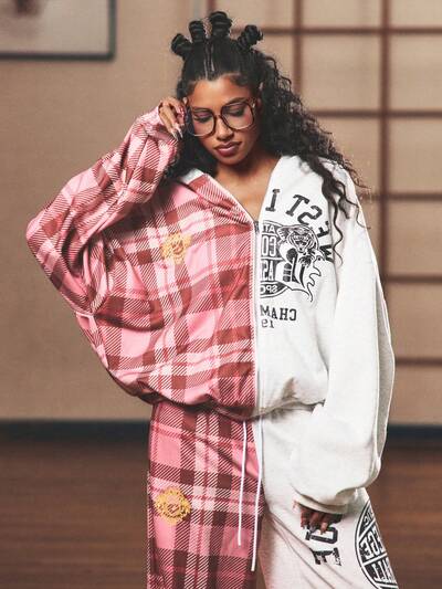 SUMWON WOMEN 스플릿 디자인 하프 지퍼 풀오버 스웨트셔츠 겨울 격자 체크 패턴 퍼 트리밍 모자 스트리트웨어 스타일 패션 대학 캠퍼스 캐주얼 라운지웨어-40%