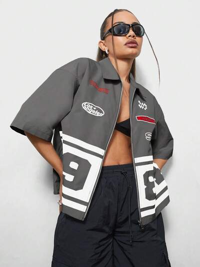 SUMWON WOMEN 나일론 레이싱 그래픽 바시티 집업 블라우스 재킷, 숫자 프린트 짧은 소매 스트리트 스타일 크롭 탑 아우터웨어-30%
