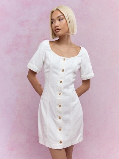 MISSGUIDED 스쿱 네크라인 짧은 소매 단추 데님 미니 드레스-45%