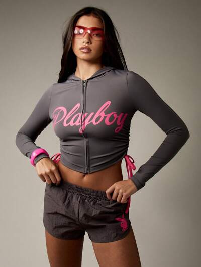 Missguided x Playboy 드로스트링 디테일이 있는 사이드 셔링 하이웨이스트 반바지-45%
