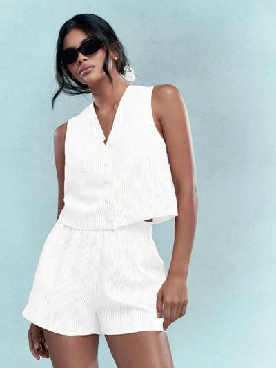 MISSGUIDED 스트라이프 버튼 프런트 슬리브리스 탑 하이웨이스트 반바지 투피스 아웃핏-45%