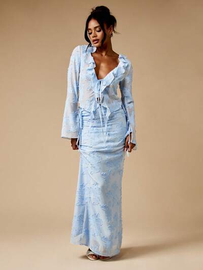 MISSGUIDED 우아한 러플 트림 긴팔 맥시 깅엄 투피스 세트-45%