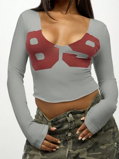 SUMWON WOMEN 스쿱 넥 긴팔 크롭 탑, 대학 프린트 그래픽 및 스테이트먼트 슬리브 포함-25%