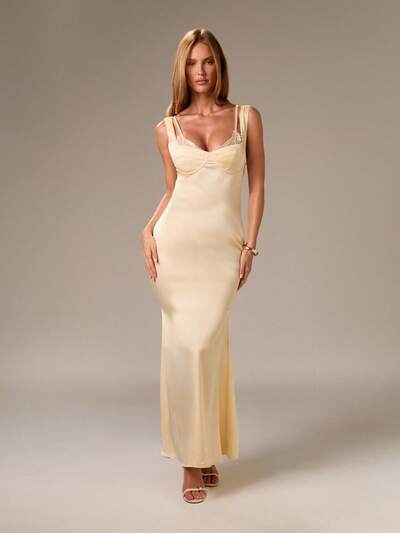 AiiRZ 뷔스티에 코르셋 디테일 플레어 인어 헴 레이스 트림 와이드 스트랩 여름 웨딩 게스트 파티 포멀 프롬 가운이 있는 슬립 이브닝 맥시 드레스-40%