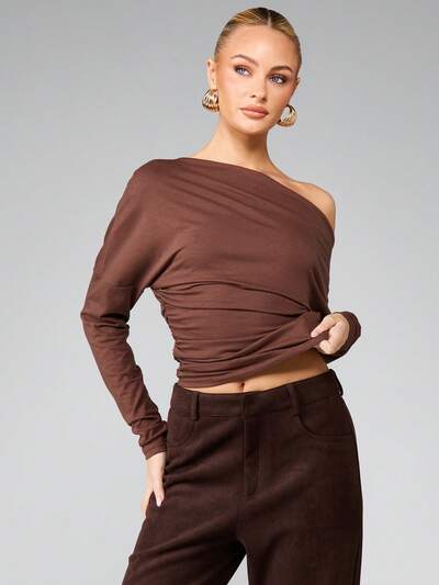 MISSGUIDED 비대칭 오프숄더 러칭 탑-40%