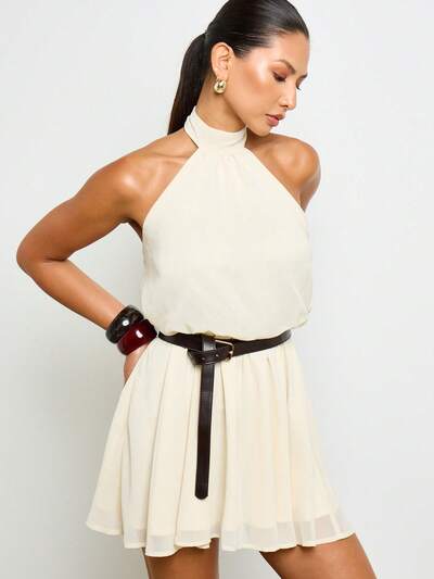 AiiRZ 홀터넥 미니 드레스 러플 쉬폰 웨딩 게스트 여름 플로이 파티 특별한 날 이브닝 스프링 우아하고 세련된 여성스러운-35%