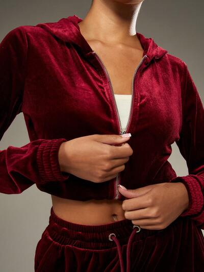 MISSGUIDED 벨벳 지퍼 스루 크롭 후드 티셔츠 (끈 포함) 크리스마스-50%