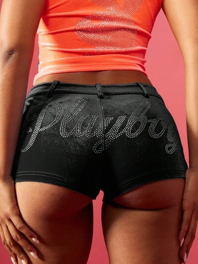 Missguided x Playboy 크리스탈 장식 디자인의 벨벳 부티 반바지-50%