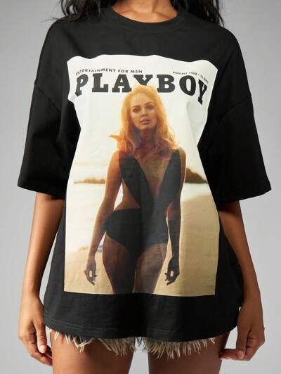 Missguided x Playboy 레트로 프린트가 있는 오버사이즈 매거진 커버 티셔츠-45%