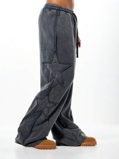 SUMWON WOMEN 여성용 오버사이즈 워싱 스타 디테일 조거 캐주얼 배기 와이드 레그 드로스트링 스웨트팬츠-25%