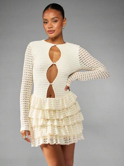 MISSGUIDED 진주 단추가 달린 티어드 크로셰 레이스 미니 드레스-50%