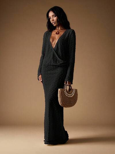 MISSGUIDED Textured Wrap Maxi Dress With Plunge Neckline-50%