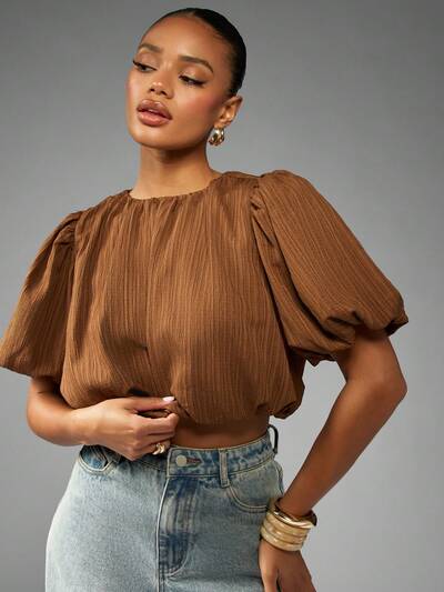 MISSGUIDED Puff Sleeve Pleated Crop Blouse With Gathered Neckline