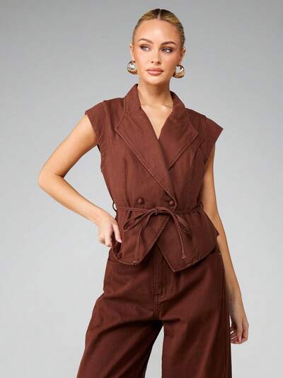 MISSGUIDED Double Breasted Sleeveless Denim Vest With Belt-10%