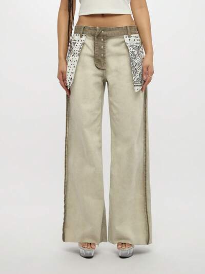 SUMWON WOMEN Wide Leg Inside Out Jean Palazzo Pants Bandana Scarf Detailing Distressed Raw Edge Festival Summer Spring Hippie Boho Bohemian