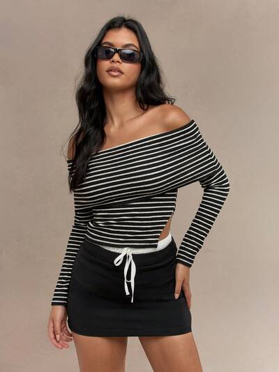MISSGUIDED Striped Side Slit Long Sleeves Bardot Top-40%