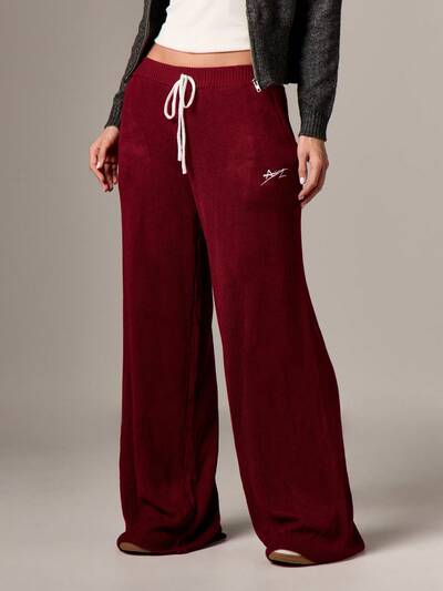 AiiRZ Burgundy Crochet Wide Leg Palazzo Pants With Drawstring Waist For Fall Winter Comfort-50%
