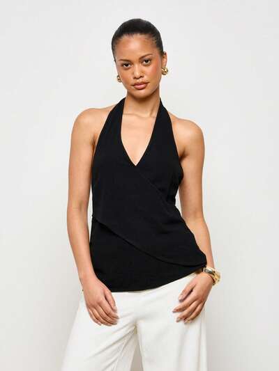 AiiRZ Linen Wrap Halter Top Backless Summer Tank Modern Professional Sleeveless Business Casual Office Evening Versatile Blouse