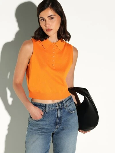 KSTM Sleeveless Collared Polo Knit Top With Button Front Placket Ribbed Hem-45%