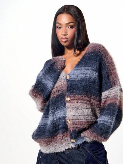 SUMWON WOMEN Oversized Striped Fluffy Button Front Cardigan With Horizontal Color Block Pattern Fall Winter Knitwear