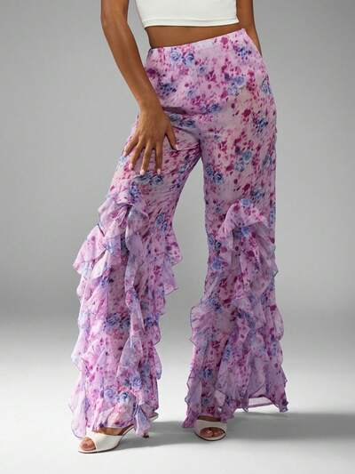 MISSGUIDED Floral Printed Chiffon Pants With Ruffle Flare Details