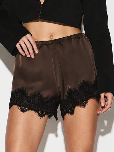 KIZN Luxurious Satin Shorts With Intricate Black Lace Hem Detail High Waisted Elegant Sleepwear Lounge Shorts For Evening Relaxation Summer Comfort-20%
