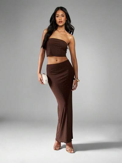 MISSGUIDED Two Piece Embellished Rhinestone Tube Top Maxi Skirt Set