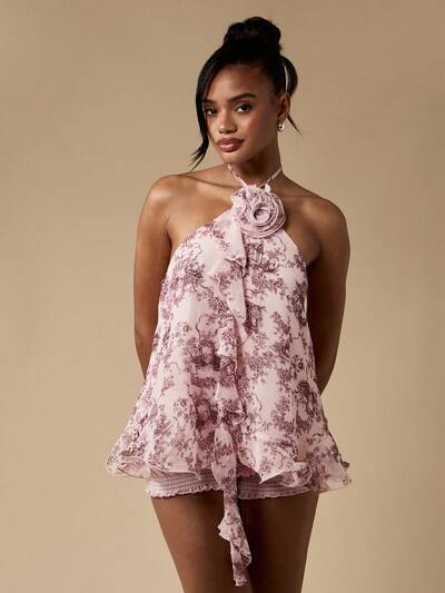 MISSGUIDED Flowy Ruffle Toile Print Halter Cami With Floral Accent-15%