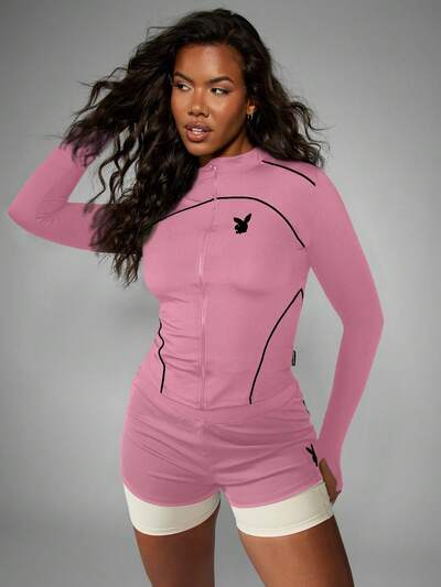 Missguided x Playboy Zip Through Top With Contrast Piping-15%