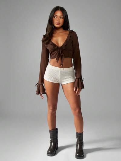 MISSGUIDED Ruffle Trim Chiffon Long Bell Sleeve Crop Boho Top-35%