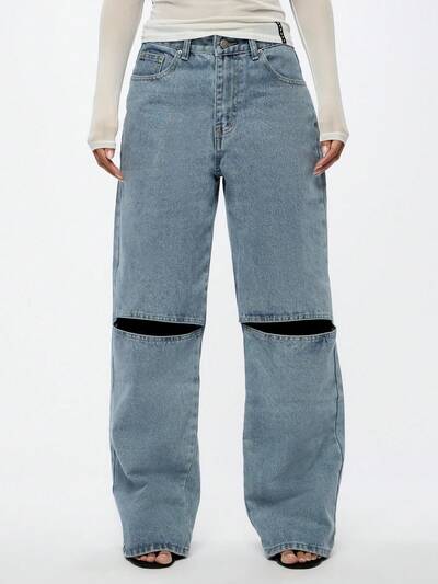 SUMWON WOMEN Cotton High Rise Baggy Wide Leg Jeans With Contrast Knit Waistband And Distressed DetailsCode: SAVE25