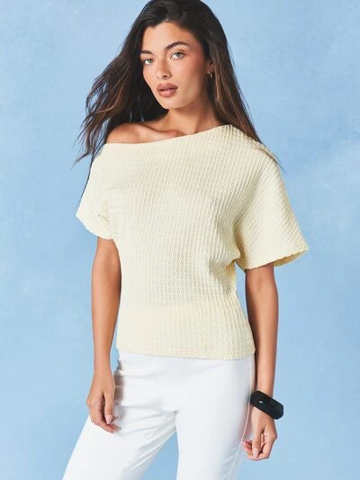 AiiRZ Women's Crinkle Textured Off Shoulder Stretch Top With Asymmetric Neckline Short Sleeves Casual Blouse