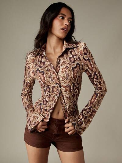 MISSGUIDED Snakeskin Print Button Up Blouse With Shoulder Pads-35%