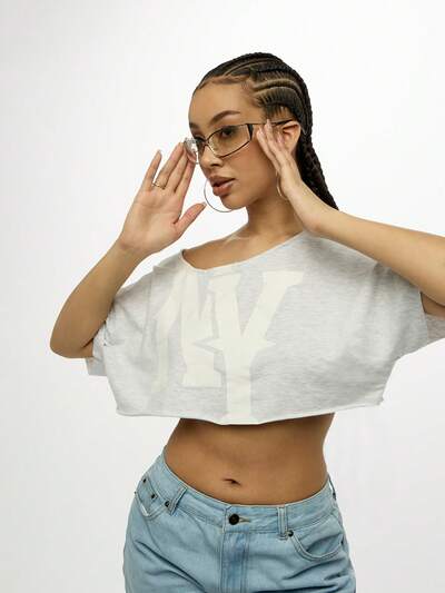 SUMWON WOMEN Off Shoulder NY Logo Crop Top Fashion Street Style Urban Casual Weekend Festival Concert Summer Cool Loose Fit Tee-45%