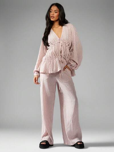 MISSGUIDED Ribbed Knit Striped Wide Leg Two-Piece Outfit