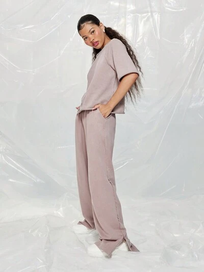 SUMWON WOMEN Washed Raglan Tee And Wide Leg Sweatpants With Slit & Exposed Raw Edge Seam-10%