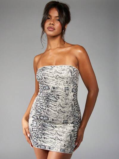 MISSGUIDED Snake Print Sequin Bandeau Strapless Bodycon Mini Dress-40%