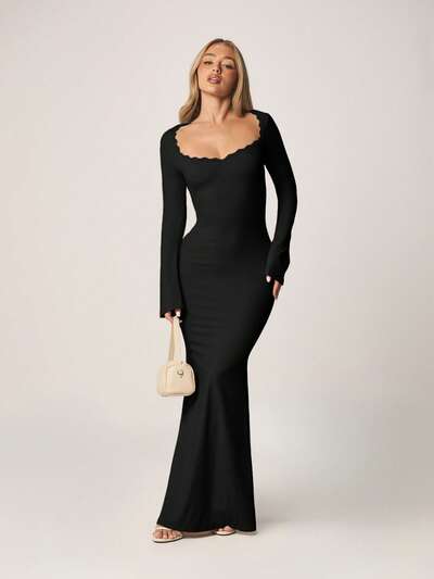 MISSGUIDED Sweetheart Neckline Long Sleeve Maxi Dress With Scalloped Trim-15%