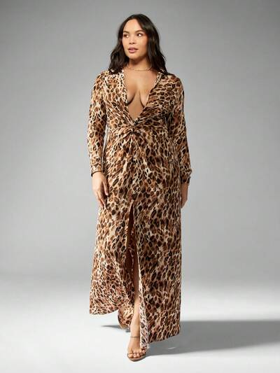 MISSGUIDED PLUS Leopard Print Long Sleeve Twist Front Maxi Plus Size Dresses-40%