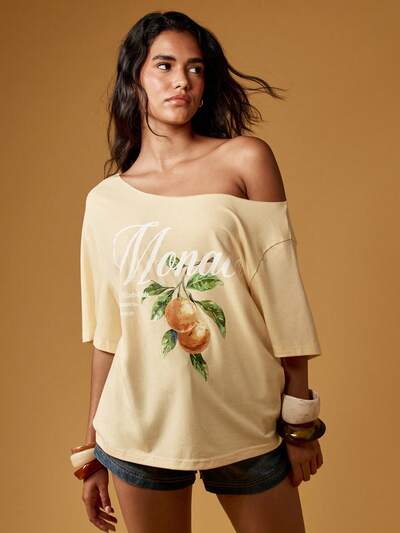 MISSGUIDED Off Shoulder Casual Orange Citrus Print Loose Fit T-Shirt-30%