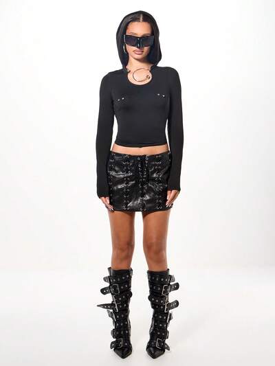 SUMWON WOMEN Hooded Jersey Top With Metal Accents And Long Sleeves