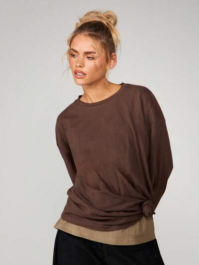 KIZN Women's Oversized Brown Cotton T-Shirt With Crew Neck Short Sleeves Relaxed Fit Casual Everyday Comfort TopCode: PAYDAY20