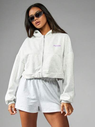 Missguided x Playboy Oversized Cropped Zip Hoodie Athleisure Streetwear-40%