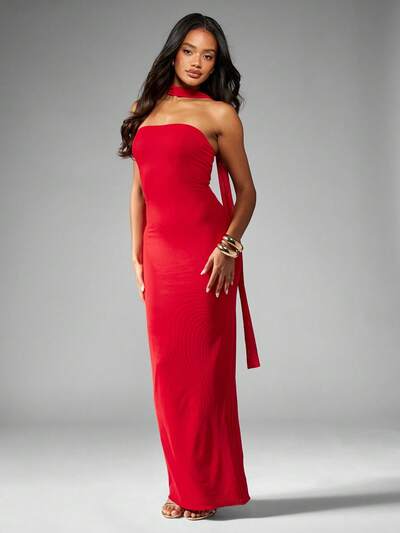 MISSGUIDED Jacquard Twisted Bust Tie Detail Waist Bandeau Maxi Dress