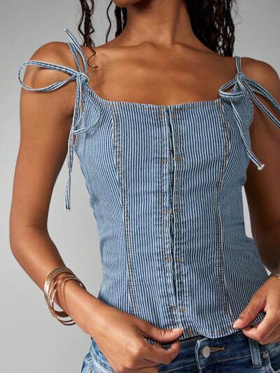 MISSGUIDED Denim Corset Bustier Stripe Pattern Hook Eye Front Tie Shoulder