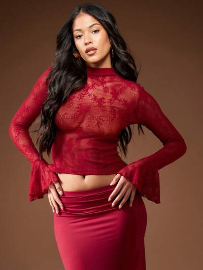 MISSGUIDED Sheer Lace Flare Cuff Long Sleeve High Neck Top Christmas