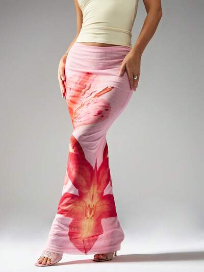KIZN Retro Swirling Abstract Print Mesh Maxi Skirt Beach Cover Up Festival Fashion Long Layered Floor Length Party Wear