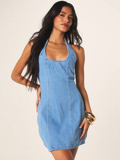 MISSGUIDED Lekka jeansowa mini sukienka z dekoltem halter i zamkiem błyskawicznym