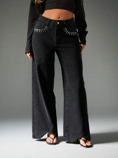 MISSGUIDED Spodnie jeansowe Baggy z szerokimi nogawkami i metalowymi ćwiekami