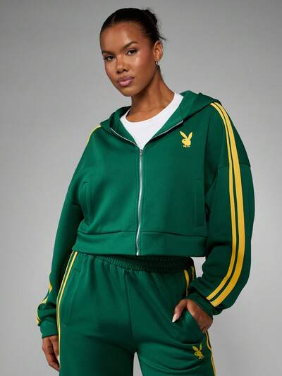 Missguided x Playboy Zielona bluza z kapturem i suwakiem w żółte paski-40%